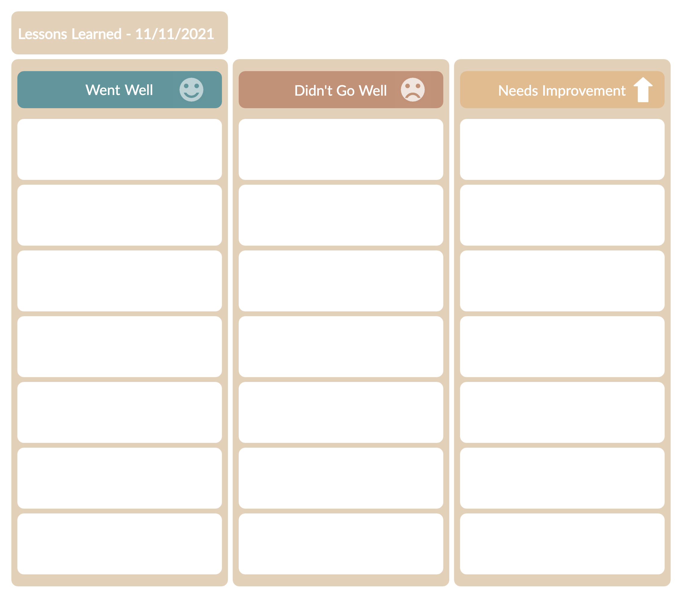 Lessons-Learned-Template Updated on: 1 February 2021 Join over thousands of organizations that use Creately to brainstorm, plan, analyze, and execute their projects successfully.Get started here Download our all-new eBook for tips on 50 powerful Business Diagrams for Strategic Planning. Get eBook Now More Related Articles No related posts.