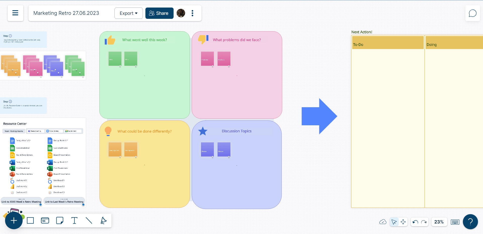 Through retrospectives, teams can gain valuable insights into their strengths and weaknesses. By leveraging Creately’s retrospective boards, you can organize and categorize ideas, observations, and feedback, making it easier to identify recurring patterns and trends. Creately’s templates are customizable and provide a structured framework for capturing and analyzing data, allowing your team to focus on actionable improvements. For more information on using Creately’s templates, see Working with Templates.